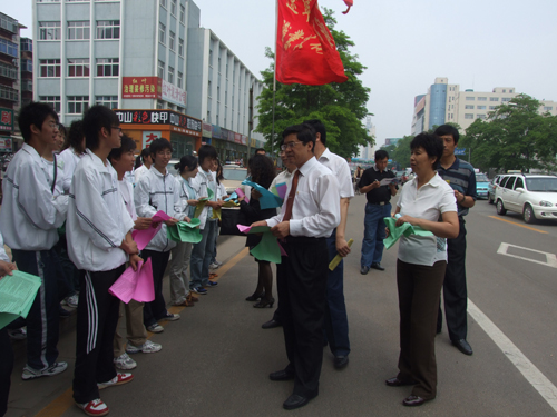 6月2日上午,學(xué)院140名機(jī)械技術(shù)系法律協(xié)會(huì)學(xué)生參加錦州市大學(xué)生普法志愿者宣誓儀式。市領(lǐng)導(dǎo)向?qū)W院普法志愿團(tuán)授予團(tuán)旗后,學(xué)生普法志愿者莊嚴(yán)宣誓。隨后,同學(xué)們?cè)诮夥怕贩比A路段參加錦州市大型普法宣傳,向市民宣傳了《消費(fèi)者權(quán)益保護(hù)法》等知識(shí),受到市民歡迎。(王愛(ài)民 李坤文,攝影孫繼明)