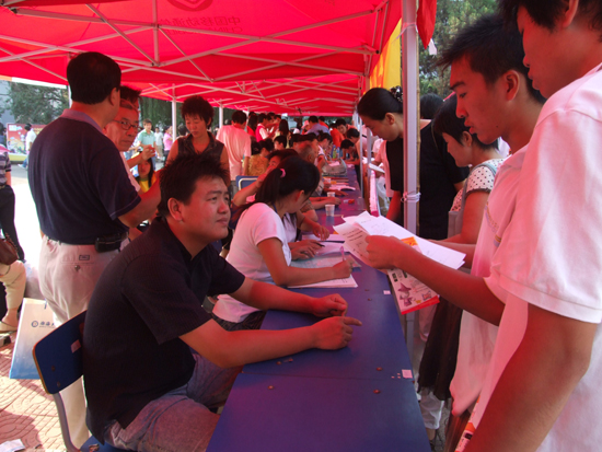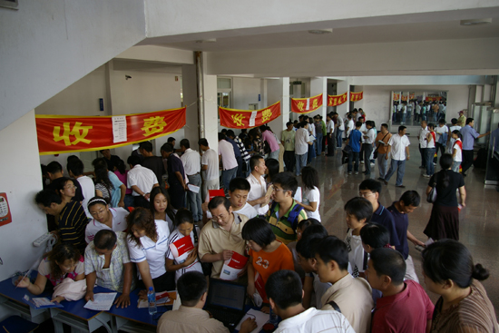 一大早,校園里就熱鬧起來。在第一教學樓報到現(xiàn)場,學生處、財務(wù)處、保衛(wèi)處、后勤等相關(guān)單位早早準備就緒,等待新生和家長的到來。接運新生的大客車往來穿梭。在辦公樓門前,各系、南校區(qū)的老師和同學用最燦爛的笑臉迎接新生,為他們指路、答疑。院團委組織的志愿者隊伍,也奔波于各個報到地點,組織排隊,熱情地幫助新生辦理各種手續(xù)。