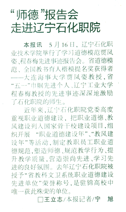 師德報(bào)告會(huì)走進(jìn)遼石化院(遼寧日?qǐng)?bào)5月18日地方新聞·錦州觀察10版報(bào)道)