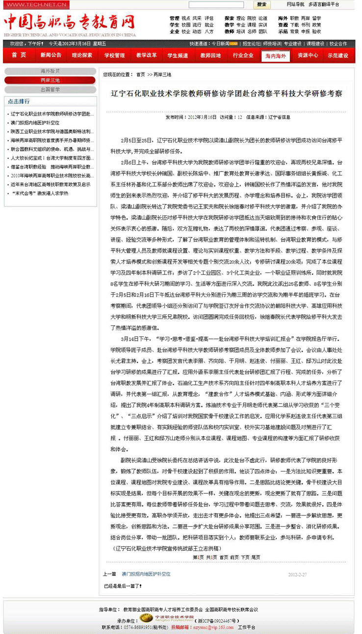 遼寧石化職業(yè)技術(shù)學(xué)院教師研修訪(fǎng)學(xué)團(tuán)赴臺(tái)灣修平科技大學(xué)研修考察(3月16日中國(guó)高職高專(zhuān)教育網(wǎng)報(bào)道)