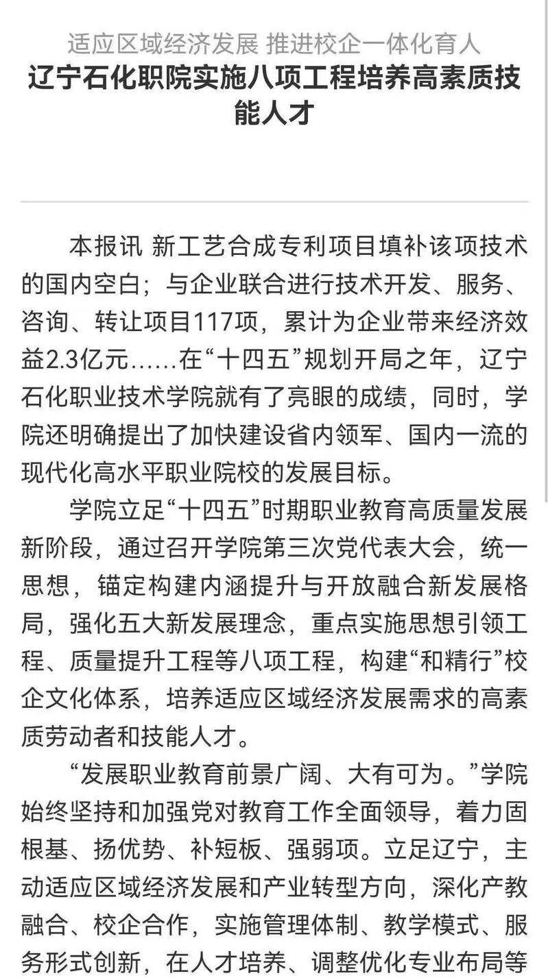 編者按:7月29日,《遼寧日?qǐng)?bào)》以“遼寧石化職院實(shí)施八項(xiàng)工程培養(yǎng)高素質(zhì)技能人才”為題,對(duì)學(xué)院適應(yīng)區(qū)域經(jīng)濟(jì)發(fā)展,推進(jìn)校企一體化育人,培養(yǎng)適應(yīng)區(qū)域經(jīng)濟(jì)發(fā)展的高素質(zhì)勞動(dòng)者和技能人才作相關(guān)報(bào)道。