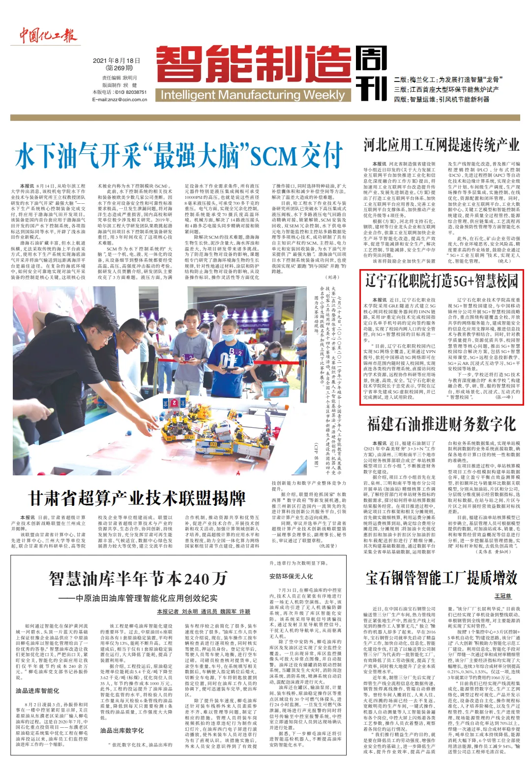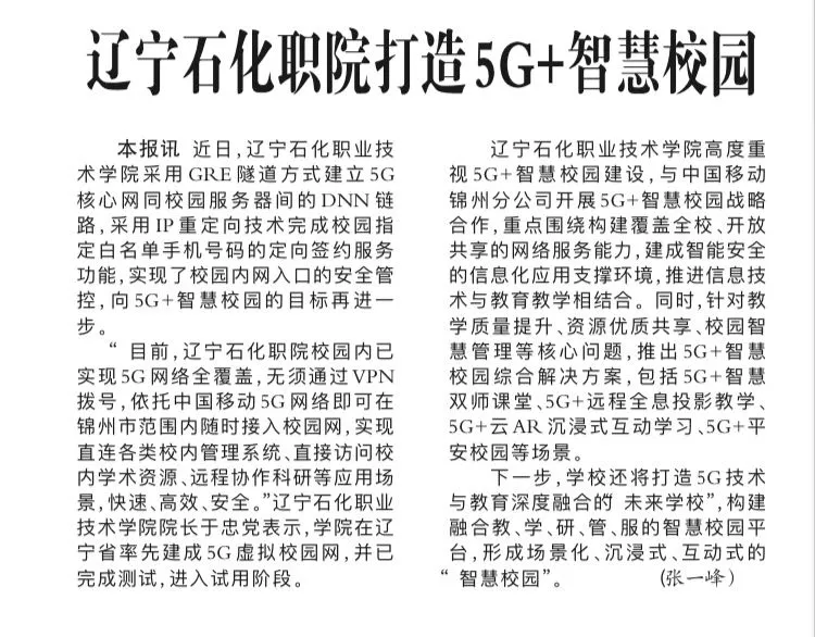 編者按:8月18日,《中國化工報(bào)》以“遼寧石化職院打造5G+智慧校園”為題,對(duì)學(xué)院率先在遼寧省內(nèi)建成5G虛擬校園網(wǎng),建設(shè)“5G+智慧校園”情況做了相關(guān)報(bào)道?!哆|寧日?qǐng)?bào)》和《錦州晚報(bào)》也對(duì)此情況做了報(bào)道。