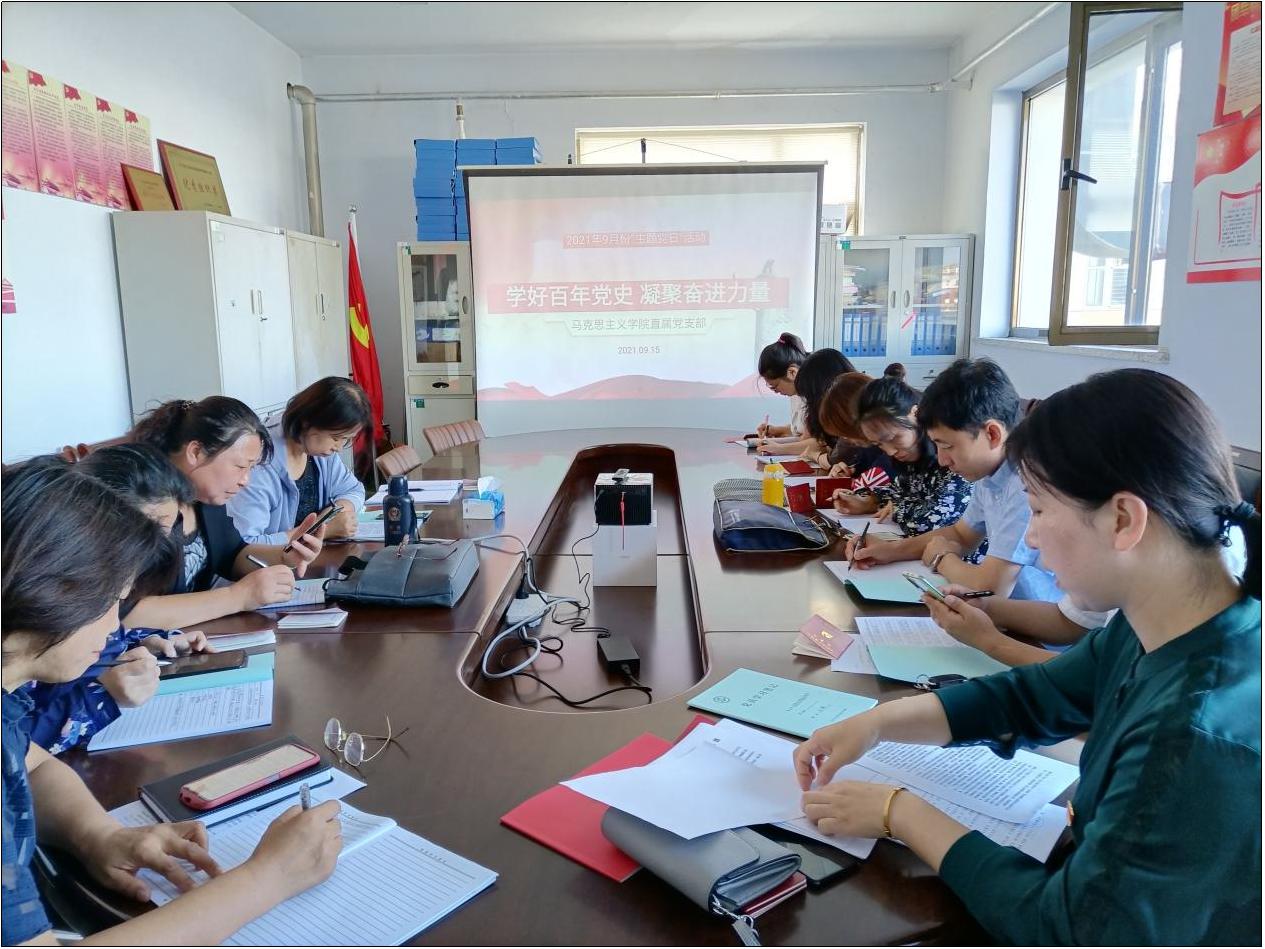 為全面貫徹落實黨中央決策部署和省委教育工委有關(guān)工作安排,按照《遼寧石化職業(yè)技術(shù)學(xué)院黨史學(xué)習(xí)教育實施方案》等文件要求,馬克思主義學(xué)院直屬黨支部于9月15日在行政機關(guān)樓509舉行“學(xué)好百年黨史凝聚奮進(jìn)力量”主題黨日活動。會議由馬克思主義學(xué)院直屬黨支部書記金鑫主持。