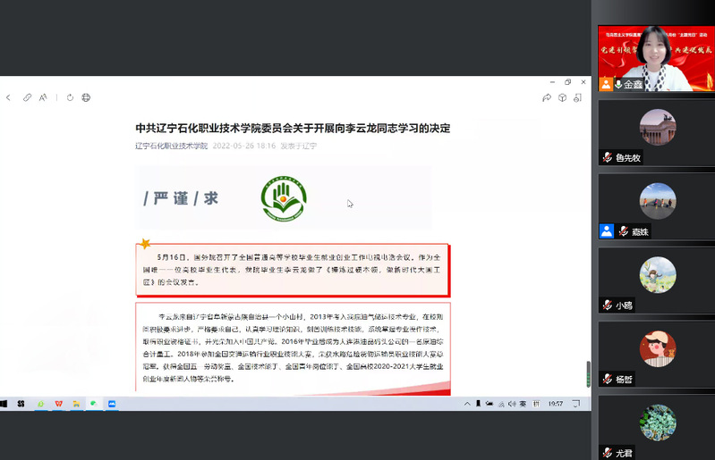 金鑫宣讀了《遼寧省教育廳關(guān)于開展向李云龍同志學習的倡議書》和《中共遼寧石化職業(yè)技術(shù)學院委員會關(guān)于開展向李云龍同志學習的決定》。領(lǐng)學了“李云龍:讓青春在技能報國中綻放光彩”先進事跡文章。邀請李云龍的專業(yè)課教師潘長滿分享李云龍學生時期的先進事跡。李云龍在校期間擔任班級團支部書記,每學期提前1個月自習備考,周六周日在教室里一復(fù)習就是一整天,起初只有他一個人這樣,在他的影響下,自習備考的同學增加到二三個、十五六個。他的學習成績連續(xù)保持班級第一名。他把“追求極致做好每一件事”當作座右銘。他能取得今天這樣的成績不僅僅是他到工作崗位后的努力所取得的,更主要的是在校期間他就有自己的規(guī)劃和目標,不斷地積蓄力量,厚積薄發(fā)。他思想要求進步,學習態(tài)度端正,認真學習理論知識,扎實訓練專業(yè)技能,逐步掌握了油氣儲運的專業(yè)操作技術(shù),獲得了職業(yè)資格證書,并光榮地加入了中國共產(chǎn)黨,為日后工作中取得一系列成績奠定了堅實的基礎(chǔ)。