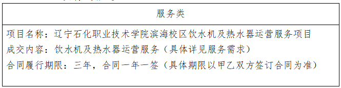 二、項(xiàng)目名稱:遼寧石化職業(yè)技術(shù)學(xué)院濱海校區(qū)飲水機(jī)及熱水器運(yùn)營(yíng)服務(wù)項(xiàng)目
