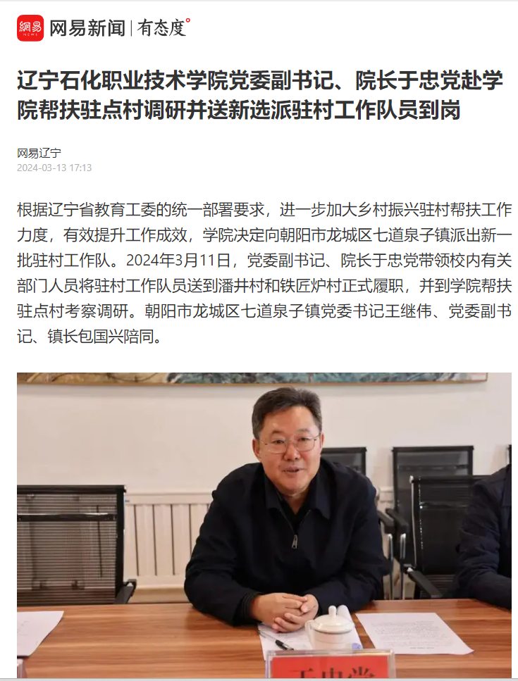 2024年3月14日,網(wǎng)易新聞以“遼寧石化職業(yè)技術(shù)學(xué)院黨委副書記、院長于忠黨赴學(xué)院幫扶駐點(diǎn)村調(diào)研并送新選派駐村工作隊員到崗”為題作出報道。