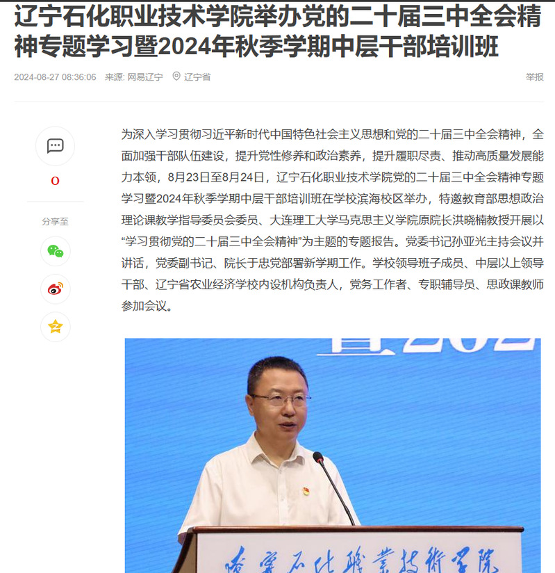 2024年8月27日,網(wǎng)易遼寧報道遼寧石化職業(yè)技術(shù)學院舉辦黨的二十屆三中全會精神專題學習暨2024年秋季學期中層干部培訓班,現(xiàn)將原文及鏈接轉(zhuǎn)載如下: