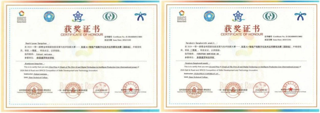經(jīng)過激烈角逐,最終斬獲該賽項國際組一、二等獎。學生Keattipoom Sangchan獲得一等獎,學生Varakorn Sangkornthanakit獲得二等獎。