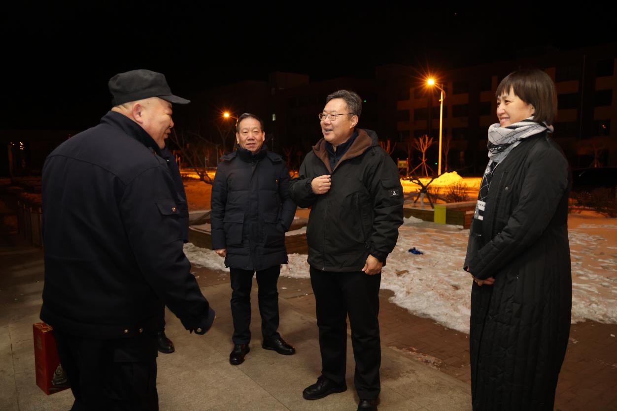 于忠黨一行先后來到古塔校區(qū)和濱海校區(qū)校區(qū)門崗、學生公寓、教學樓、辦公樓、供電供暖供水、消防監(jiān)控中心等地值班室,與在崗職工一一握手,向他們致以節(jié)日的問候和衷心的感謝。他說道:“過年好啊,大家辛苦了!在這闔家團圓的日子里,你們卻堅守在校園安全的第一線,正是因為你們的付出,學校才能平安有序?!痹谖繂栠^程中,于忠黨特別強調學校安全工作的重要性,要求各單位加強寒假期間安全值班和后勤保障工作,確保學校各項工作平穩(wěn)運轉和校園安全穩(wěn)定。
