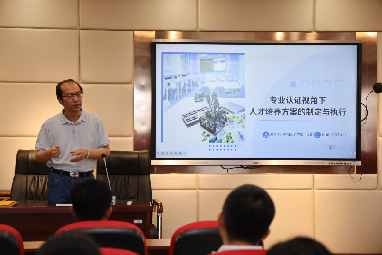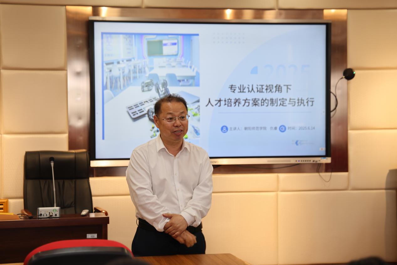 為進一步提升專業(yè)人才培養(yǎng)方案修訂質(zhì)量,6月14日,學(xué)校邀請朝陽師范學(xué)院仇睿教授來校開展題為“專業(yè)認(rèn)證視角下人才培養(yǎng)方案的制定與執(zhí)行”的專題報告。報告會由教務(wù)處長張立新主持,副院長劉朝輝、楊連成全程參加報告會。